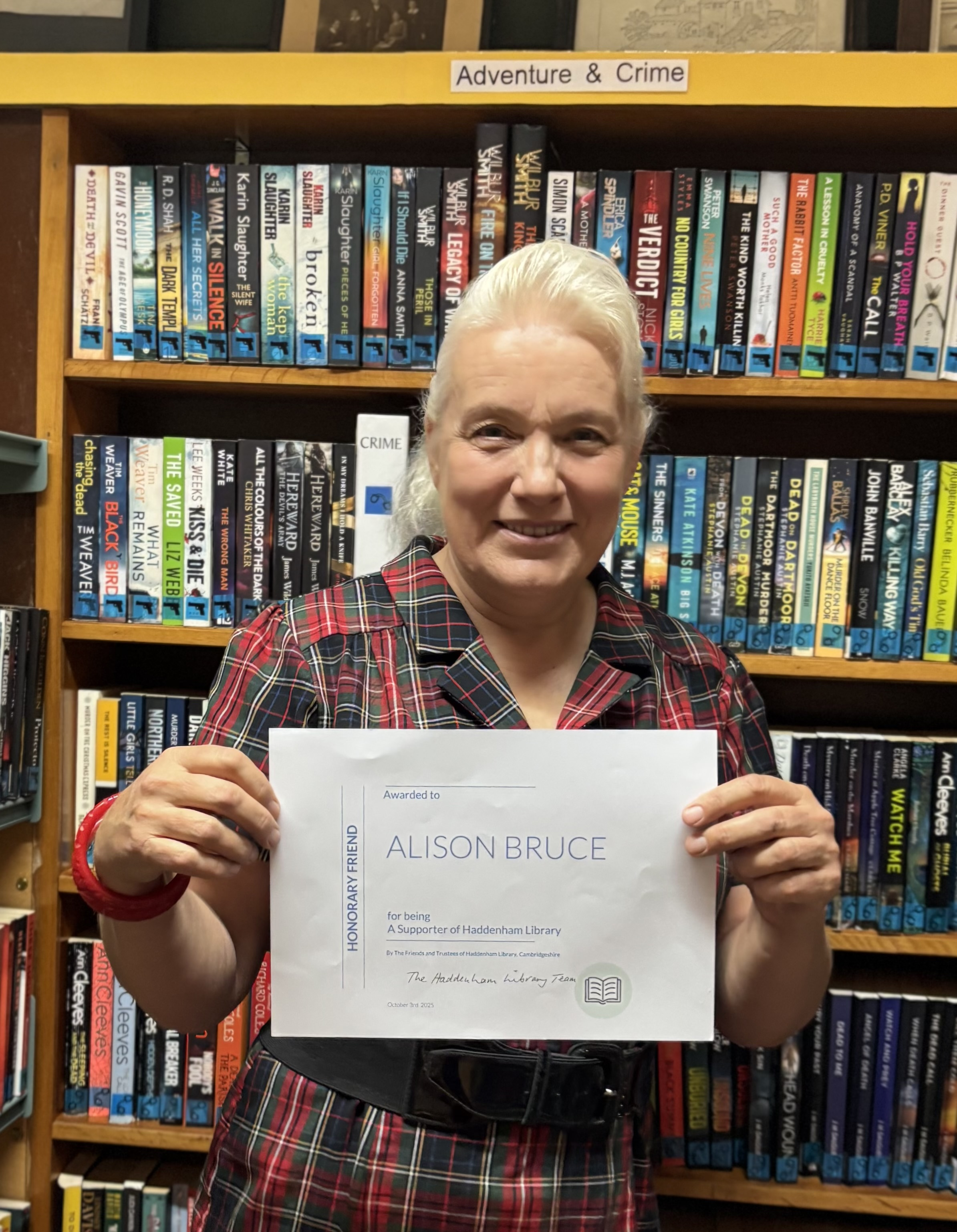 Alison visited our library on Friday 3rd October where we presented her wwith an Honorary Friend certificate.