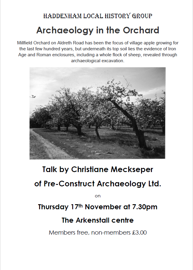 Millfield Orchard on Aldreth Road has been the focus of village apple growing for the last few hundred years, but underneath its top soil lies the evidence of Iron Age and Roman enclosures, including a whole flock of sheep, revealed through archaeological excavation.