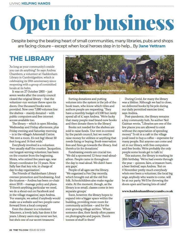 To join us, speak to a Library volunteer, or drop a line to info@haddenhamlibrarycambs.co.uk.