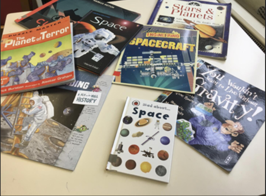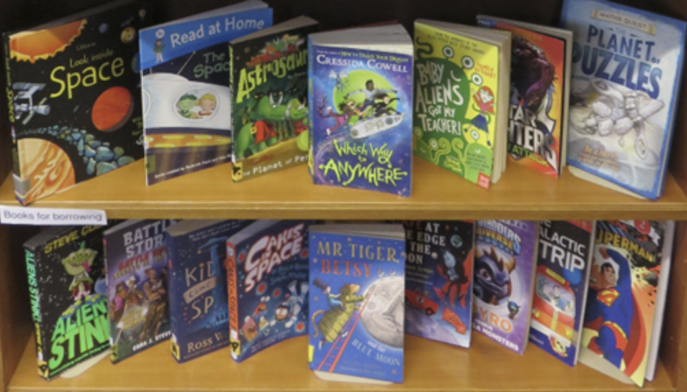 The library welcomed Earth, Saturn and Mercury classes from Robert Arkenstall School to share stories, books, craft activities and more on this special day in the book world calendar. The photos show a few of our space theme non-fiction books, some of our fiction currently on the display shelf and a few of the pictures the children coloured. These will be put on display in the library in due course.